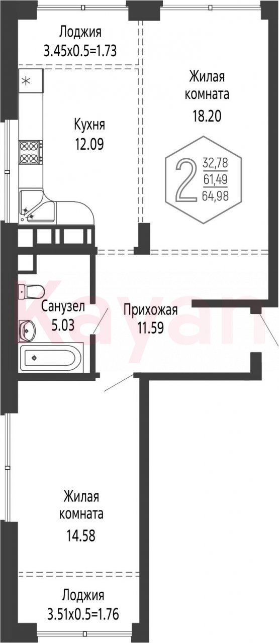 Квартира в ЖК «Гарантия на Обрывной» (Гарантия) литер 2 очередь 2, Кирпично-монолитный, 2 к.кв., 61.49 кв.м., 19/24, высота потолков: 2.74 м, жилая площадь: 32.78 кв.м., возможна ипотека, площадь кухни 12.09 кв.м.,