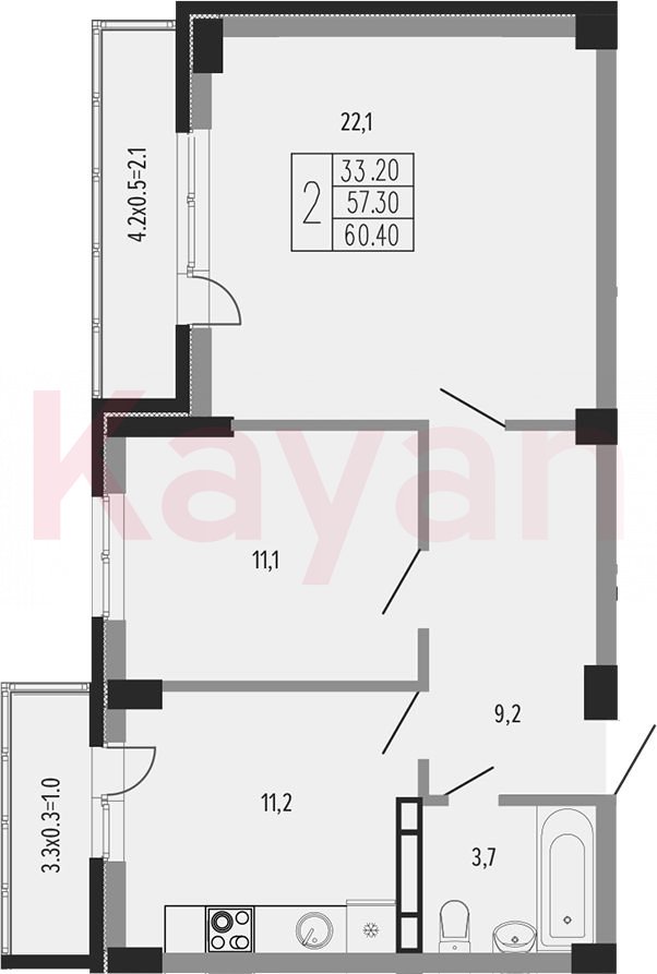 Продажа 2-комн. квартиры, 57.3 кв.м