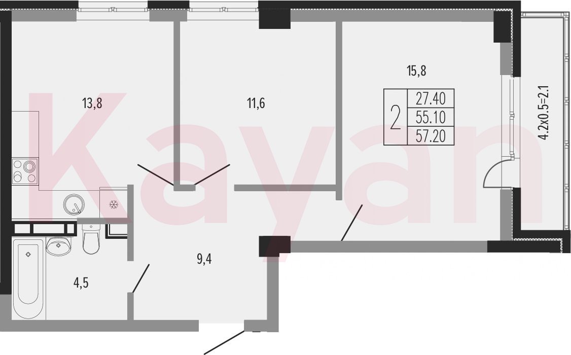 Продажа 2-комн. квартиры, 55.1 кв.м