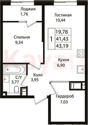Квартира в ЖК «Патрики» (ГК Точно. Краснодарский край) литер 1.3 очередь 1, Кирпично-монолитный, 2 к.кв., 41.43 кв.м., 4/18, высота потолков: 2.7 м, жилая площадь: 9.34 кв.м., возможна ипотека, площадь кухни 17.34 кв.м.,