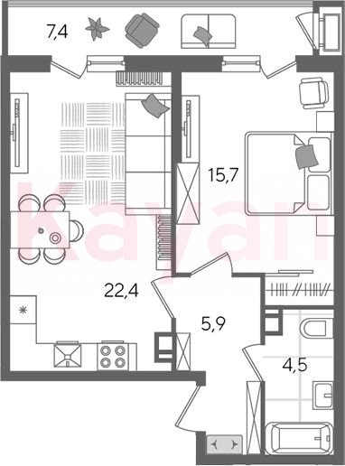 Квартира в ЖК «Рекорд» (DOGMA. Краснодар) литер 2 очередь 3, Кирпично-монолитный, 2 к.кв., 48.5 кв.м., 5/24, высота потолков: 2.72 м, жилая площадь: 15.7 кв.м., возможна ипотека, возможна военная ипотека, площадь кухни 22.4 кв.м.,