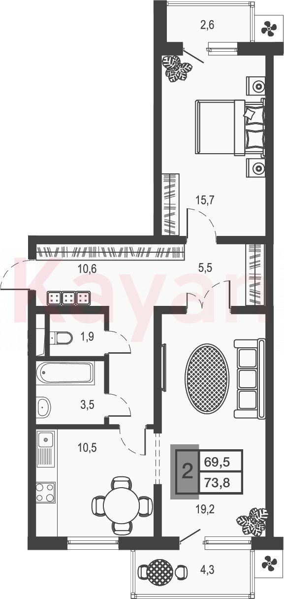 В проекте представлено множество планировочных решений: от 1-комнатных до 3х-комнатных квартир с собственным балконом или лоджией. На первом этаже здания располагаются апартаменты с отдельным входом и увеличенными окнами и потолками 3,3 метра. Из комплекса открывается вид на Карасунские озера.