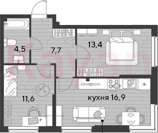 Квартира в ЖК «Dogma park (Догма парк)» (DOGMA. Краснодар) литер 16 очередь 2, Кирпично-монолитный, 2 к.кв., 54.1 кв.м., 2/16, высота потолков: 2.72 м, жилая площадь: 25 кв.м., возможна ипотека, возможна военная ипотека, площадь кухни 16.9 кв.м.,