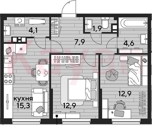 Квартира в ЖК «Dogma park (Догма парк)» (DOGMA. Краснодар) литер 17 очередь 2, Кирпично-монолитный, 2 к.кв., 59.6 кв.м., 8/16, высота потолков: 2.72 м, жилая площадь: 25.8 кв.м., возможна ипотека, возможна военная ипотека, площадь кухни 15.3 кв.м.,