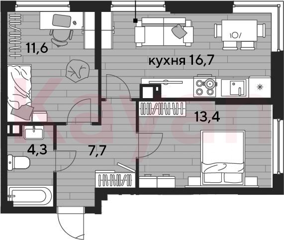 Квартира в ЖК «Dogma park (Догма парк)» (DOGMA. Краснодар) литер 18 очередь 2, Кирпично-монолитный, 2 к.кв., 53.7 кв.м., 6/16, высота потолков: 2.72 м, жилая площадь: 25 кв.м., возможна ипотека, возможна военная ипотека, площадь кухни 16.7 кв.м.,
