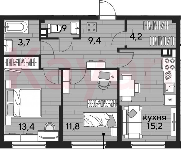 Квартира в ЖК «Dogma park (Догма парк)» (DOGMA. Краснодар) литер 23 очередь 2, Кирпично-монолитный, 2 к.кв., 59.6 кв.м., 4/16, высота потолков: 2.72 м, жилая площадь: 25.2 кв.м., возможна ипотека, возможна военная ипотека, площадь кухни 15.2 кв.м.,