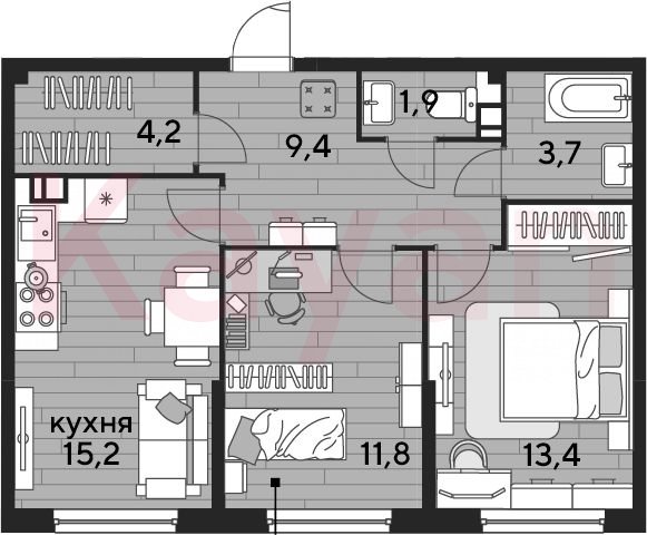 Квартира в ЖК «Dogma park (Догма парк)» (DOGMA. Краснодар) литер 24 очередь 2, Кирпично-монолитный, 2 к.кв., 59.6 кв.м., 4/16, высота потолков: 2.72 м, жилая площадь: 25.2 кв.м., возможна ипотека, возможна военная ипотека, площадь кухни 15.2 кв.м.,