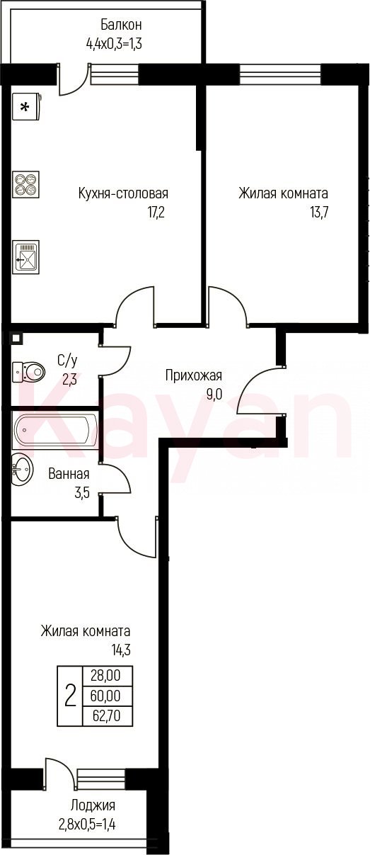 Продажа 2-комн. квартиры, 60.9 кв.м