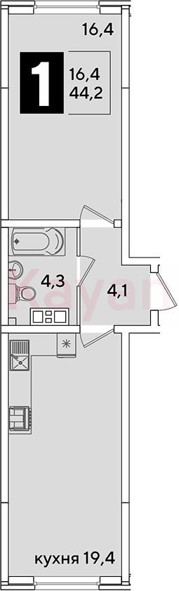 Квартира в ЖК Самолет (DOGMA. Краснодар) литер 64 очередь 6, Кирпично-монолитный, 2 к.кв., 44.2 кв.м., 9/16, высота потолков: 2.89 м, жилая площадь: 16.4 кв.м., возможна ипотека, возможна военная ипотека, площадь кухни 19.4 кв.м.,