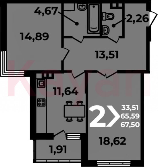 Продажа 2-комн. квартиры, 65.59 кв.м