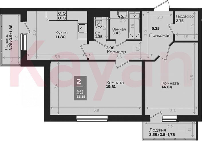 Продажа 2-комн. квартиры, 62.49 кв.м