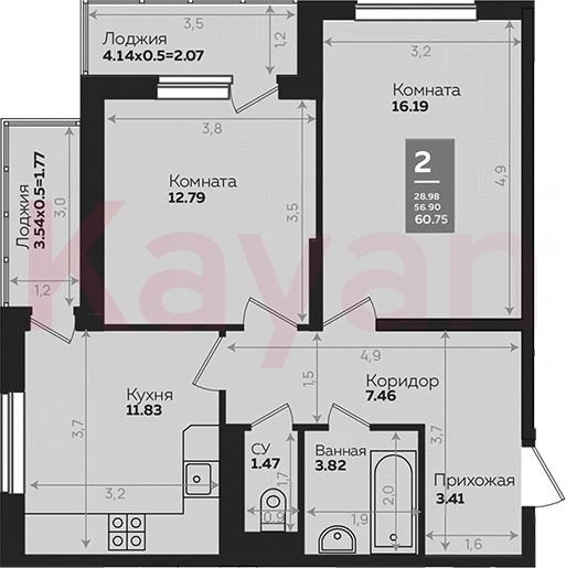 Продажа 2-комн. квартиры, 56.91 кв.м