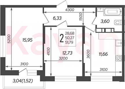Квартира в ЖК «Смородина» (AVA Краснодар) литер 11 очередь 2, Кирпично-монолитный, 2 к.кв., 50.27 кв.м., 14/16, высота потолков: 2.75 м, жилая площадь: 28.68 кв.м., возможна ипотека, площадь кухни 11.66 кв.м.,