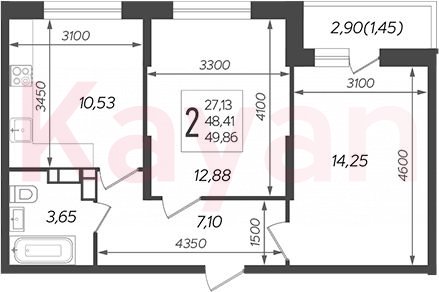 Квартира в ЖК «Смородина» (AVA Краснодар) литер 14 очередь 2, Кирпично-монолитный, 2 к.кв., 48.41 кв.м., 17/19, высота потолков: 2.75 м, жилая площадь: 27.13 кв.м., возможна ипотека, площадь кухни 10.53 кв.м.,