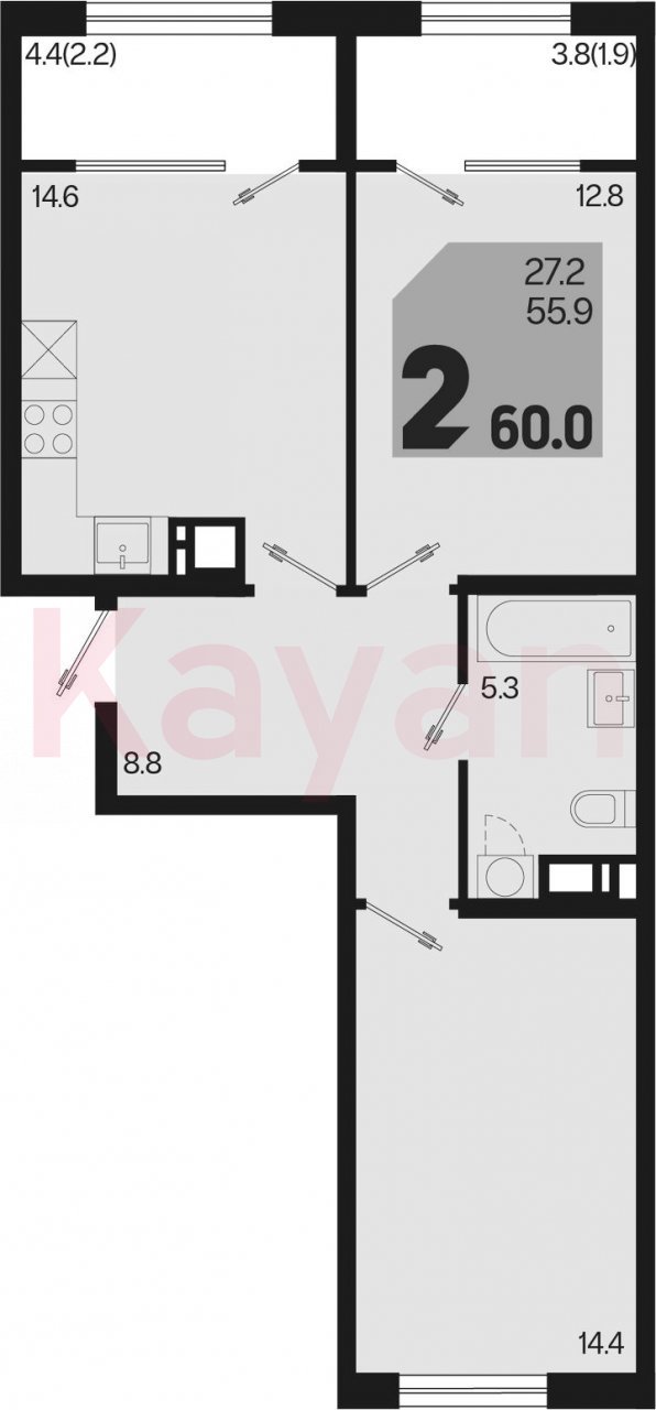Продажа 2-комн. квартиры, 55.9 кв.м