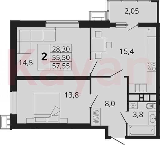 Продажа 2-комн. квартиры, 55.5 кв.м