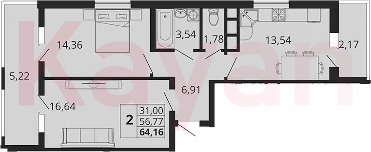 Продажа 2-комн. квартиры, 56.77 кв.м