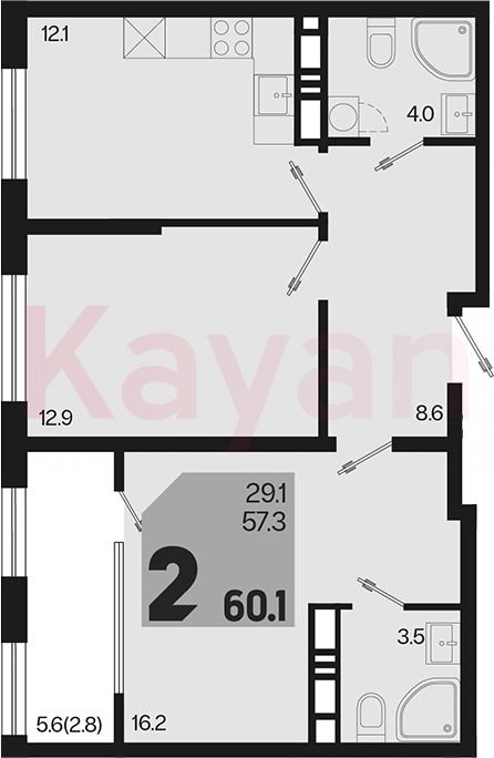 Продажа 2-комн. квартиры, 57.3 кв.м