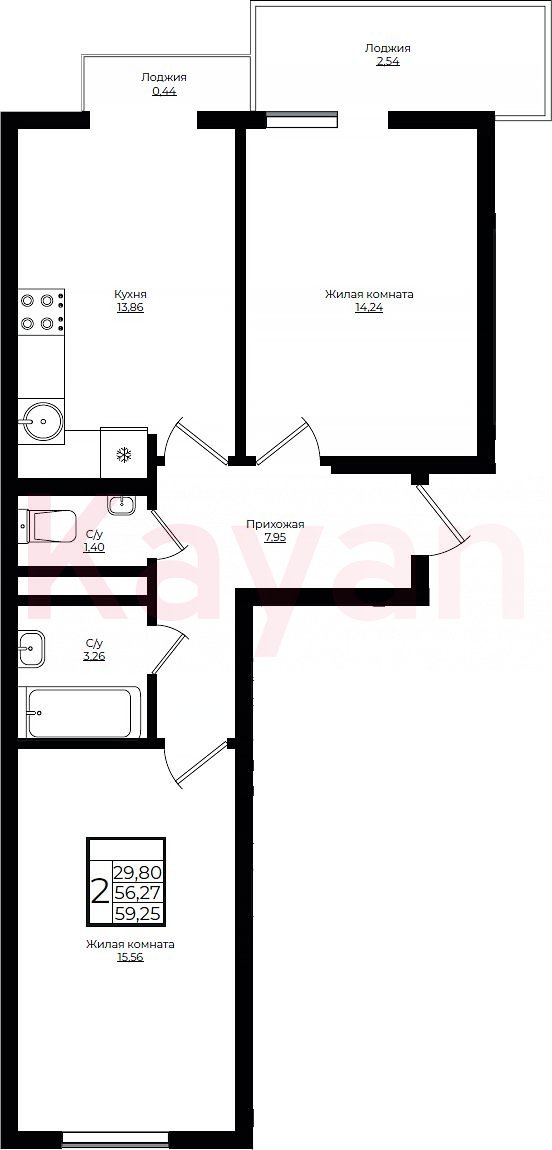 Продажа 2-комн. квартиры, 56.27 кв.м