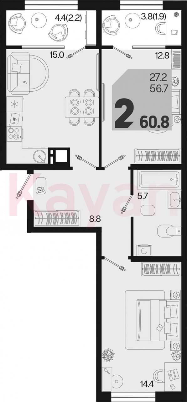 Продажа 2-комн. квартиры, 56.7 кв.м