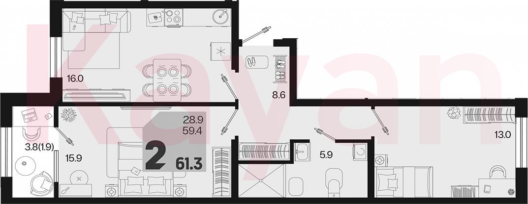Продажа 2-комн. квартиры, 59.4 кв.м