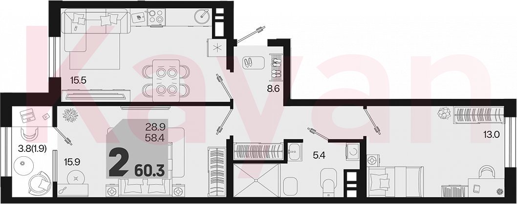 Продажа 2-комн. квартиры, 58.4 кв.м