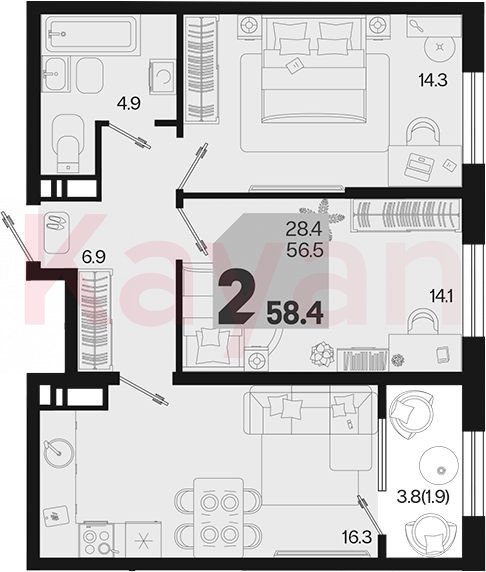 Продажа 2-комн. квартиры, 56.5 кв.м