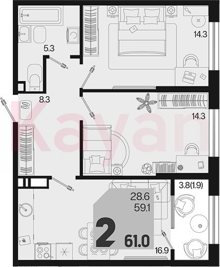 Продажа 2-комн. квартиры, 59.1 кв.м