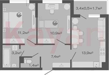 Квартира в ЖК «ДЗЕНПАРК» (Лендекс) литер 4 очередь 1, Кирпично-монолитный, 2 к.кв., 48 кв.м., 1/4, высота потолков: 2.7 м, жилая площадь: 22.1 кв.м., возможна ипотека, возможна военная ипотека, площадь кухни 13.9 кв.м.,