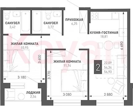 Продажа 2-комн. квартиры, 54.34 кв.м