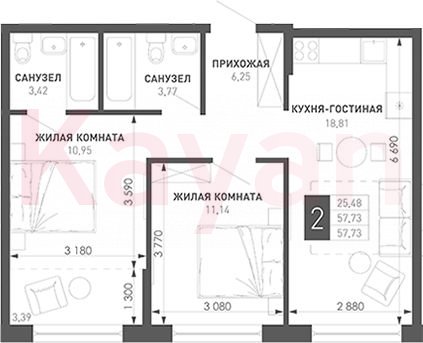 Продажа 2-комн. квартиры, 54.34 кв.м
