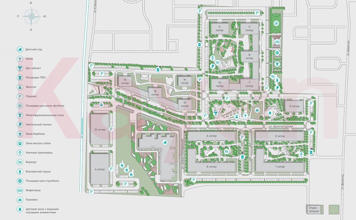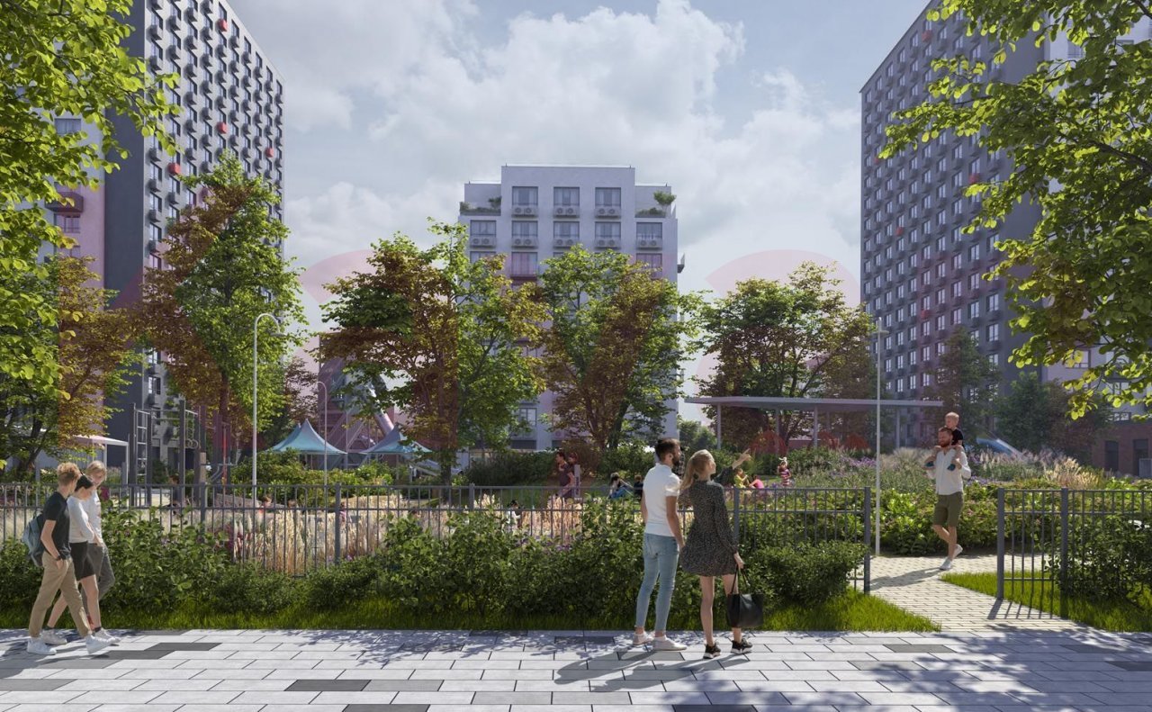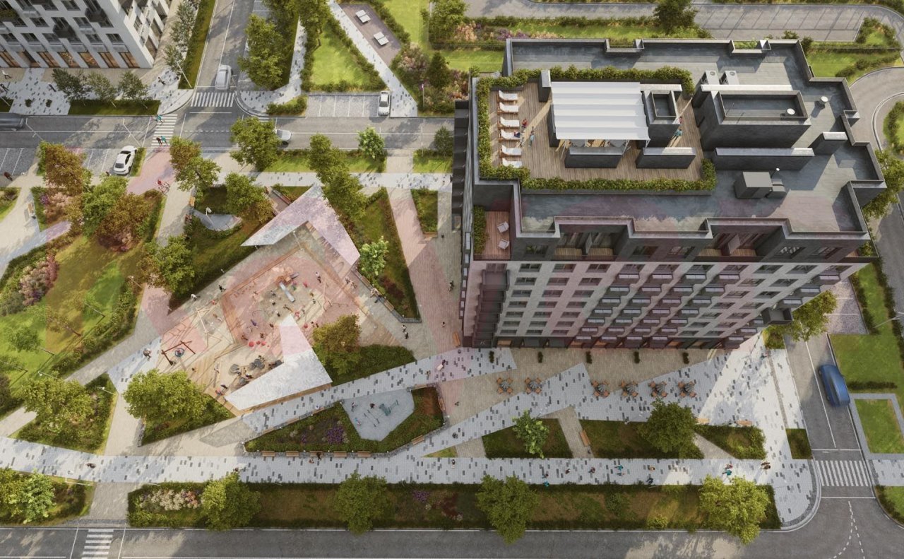 На закрытой территории комплекса выполнен ландшафтный дизайн: ухоженные газоны, зоны отдыха, коворкинги. Предусмотрены современные детские и спортивные площадки с безопасным покрытием, а также поля для мини-футбола и баскетбола. На территории комплекса ведется круглосуточное видеонаблюдение. Также здесь располагается детский сад на 350 мест. Для владельцев автомобилей предусмотрен отдельный многоуровневый паркинг.