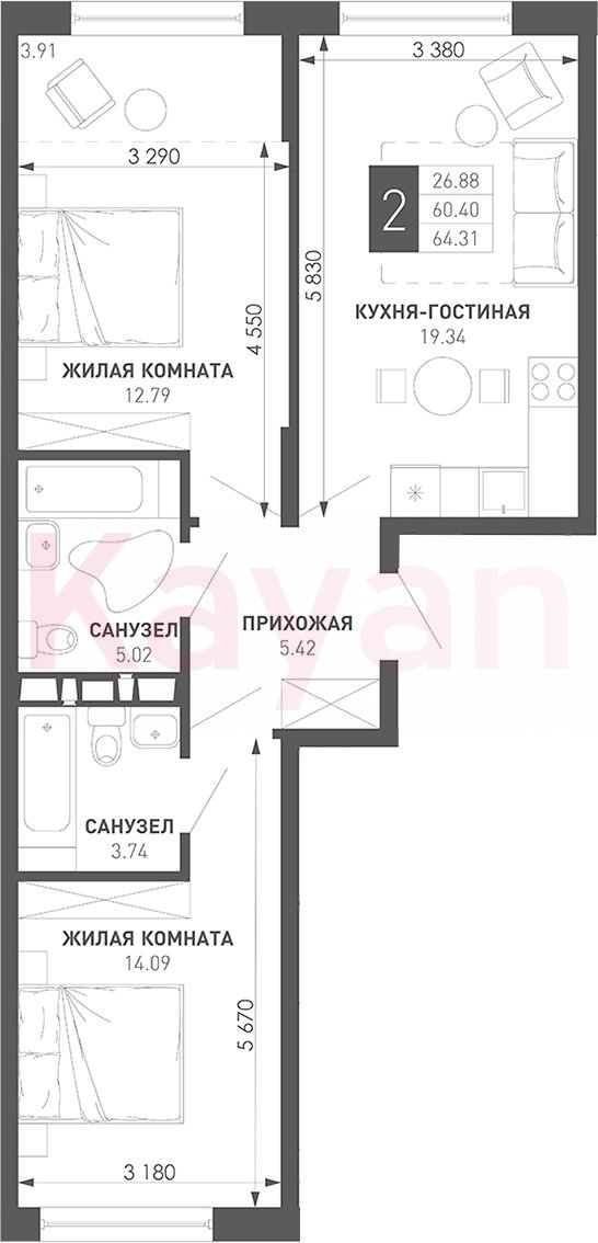 Продажа 2-комн. квартиры, 60.4 кв.м