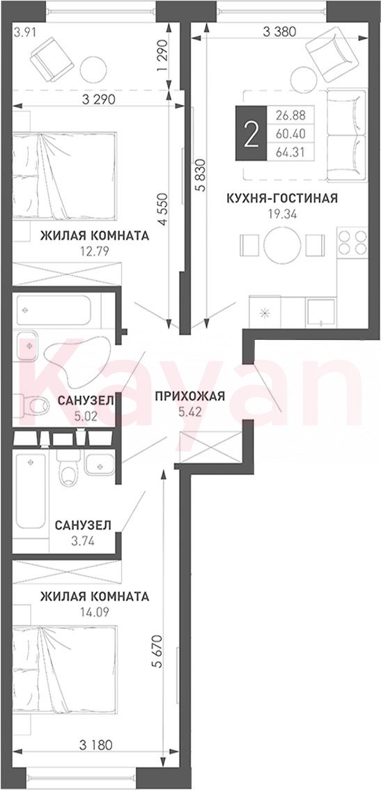 Продажа 2-комн. квартиры, 60.4 кв.м