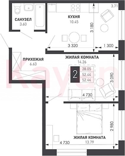 Продажа 2-комн. квартиры, 48.73 кв.м
