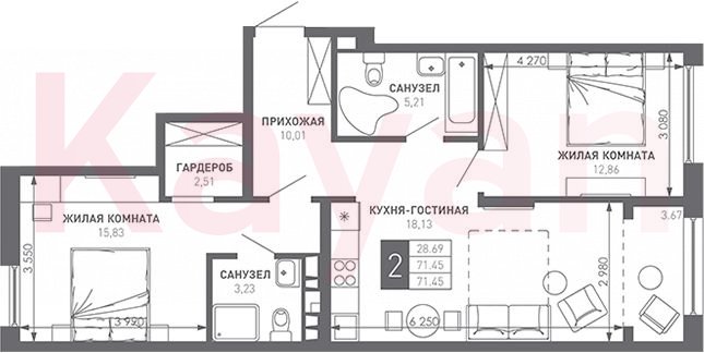 Продажа 2-комн. квартиры, 71.45 кв.м