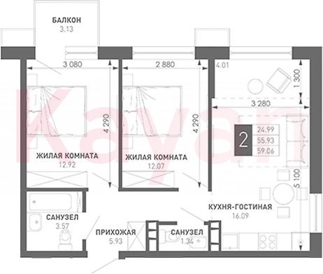 Продажа 2-комн. квартиры, 51.92 кв.м
