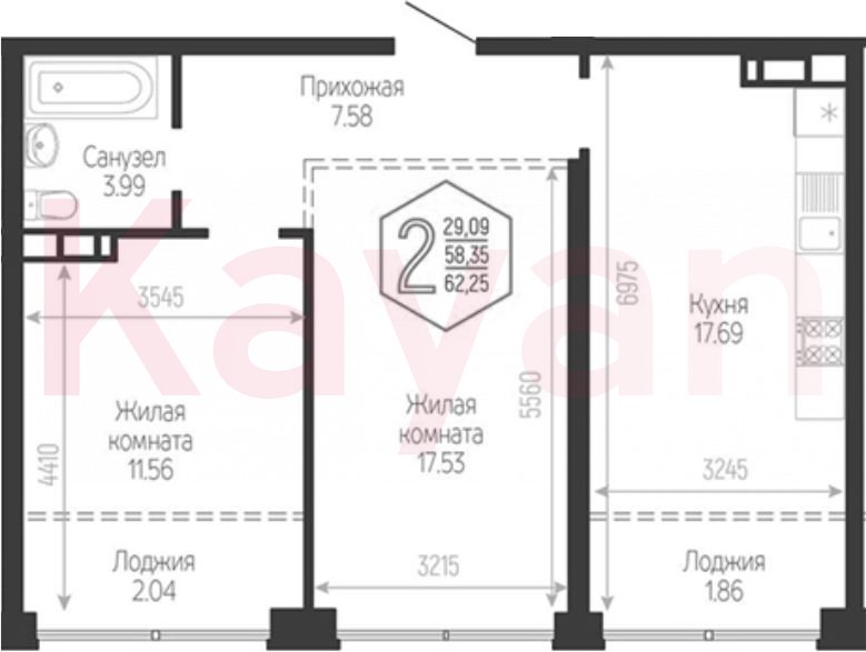 Продажа 2-комн. квартиры, 58.35 кв.м