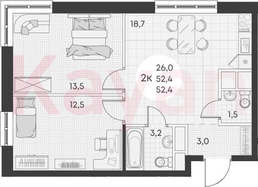 Продажа 2-комн. квартиры, 52.4 кв.м