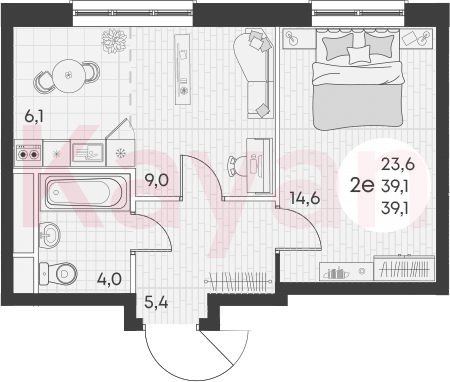 Квартира в ЖК «Green Apple» (БЭЛ-Девелопмент) литер 1 очередь 1, Кирпично-монолитный, 2 к.кв., 39.1 кв.м., 9/16, высота потолков: 2.8 м, жилая площадь: 14.6 кв.м., возможна ипотека, площадь кухни 15.1 кв.м.,