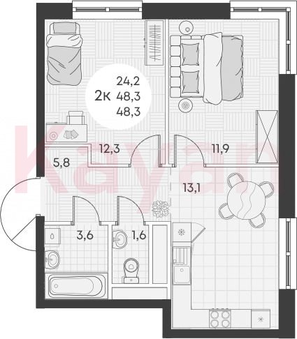 Продажа 2-комн. квартиры, 48.3 кв.м