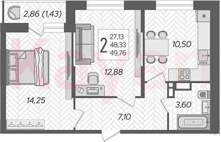 Квартира в ЖК «Смородина» (AVA Краснодар) литер 2 очередь 2, Кирпично-монолитный, 2 к.кв., 48.33 кв.м., 16/16, высота потолков: 2.75 м, жилая площадь: 27.13 кв.м., возможна ипотека, площадь кухни 10.5 кв.м.,