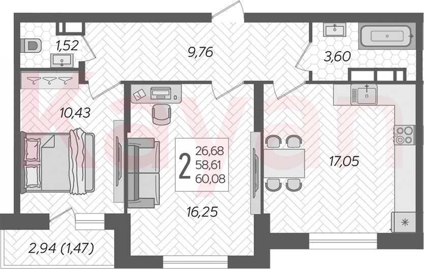 Продажа 2-комн. квартиры, 58.61 кв.м
