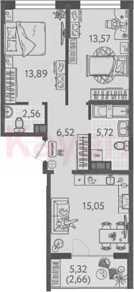 Продажа 2-комн. квартиры, 57.31 кв.м