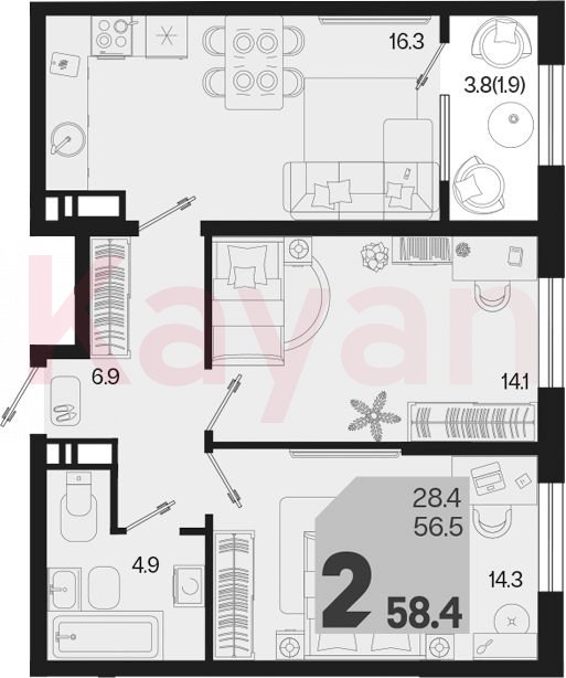 Продажа 2-комн. квартиры, 56.5 кв.м