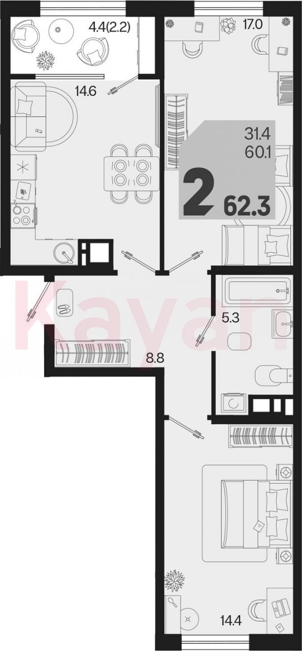 Продажа 2-комн. квартиры, 60.1 кв.м