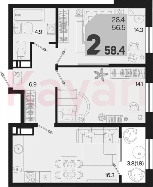 Продажа 2-комн. квартиры, 56.5 кв.м