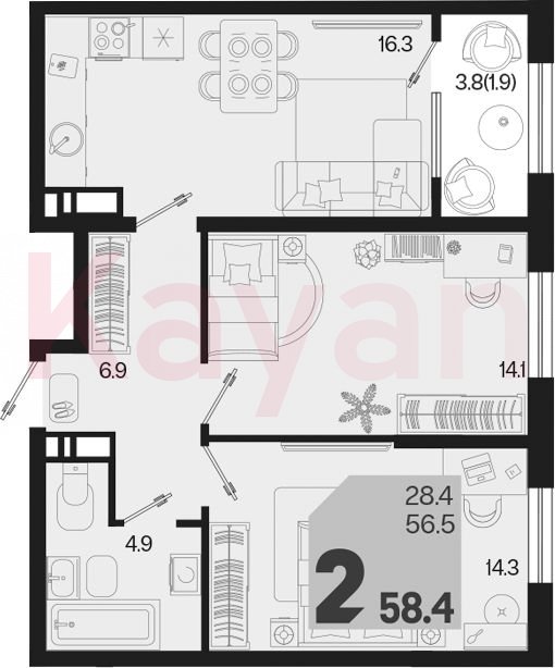 Продажа 2-комн. квартиры, 56.5 кв.м