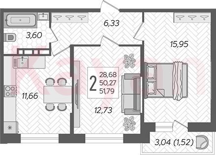 Квартира в ЖК «Смородина» (AVA Краснодар) литер 18 очередь 2, Кирпично-монолитный, 2 к.кв., 50.27 кв.м., 1/12, высота потолков: 2.75 м, жилая площадь: 28.68 кв.м., возможна ипотека, площадь кухни 11.66 кв.м.,