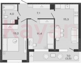 Квартира в ЖК «ДЗЕНПАРК» (Лендекс) литер 2 очередь 1, Кирпично-монолитный, 2 к.кв., 51 кв.м., 2/4, высота потолков: 2.7 м, жилая площадь: 24.6 кв.м., возможна ипотека, возможна военная ипотека, площадь кухни 15.3 кв.м.,